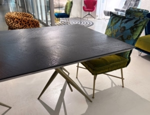 Ohlinda Ess- und/oder Konferenztisch mit goldenen handwerklich geschliffenen Stahbeinen und Tischplatte Burnt Oak. Die rustikalen Eichenplanken sind schichtverleimt und nach japanischer Methode „flambiert“.